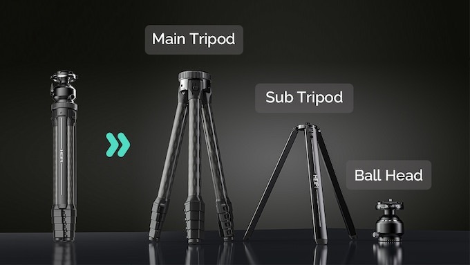 Convert into standard tripod, mini tripod, removable ball head | Fast deployment | Ultrastable carbon fiber round legs | Phone-friendly