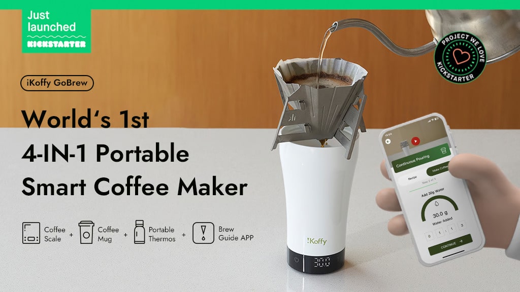 Brewing Excellence Pour-Over Made Simple, Anywhere. GoBrew=Coffee Scale + Coffee Mug +Portable Thermos + Brew Guide APP.