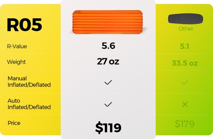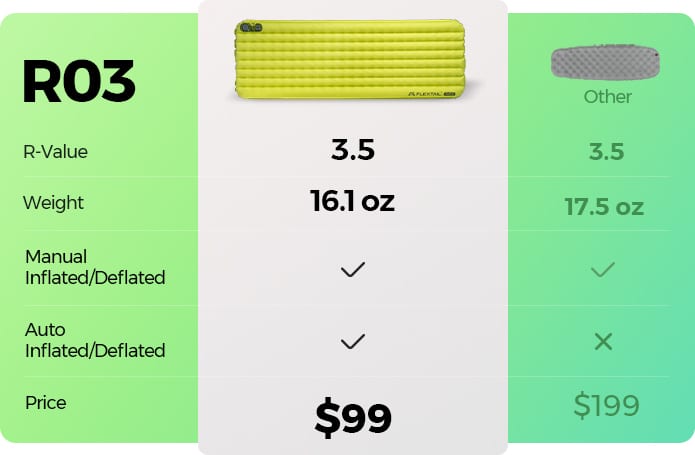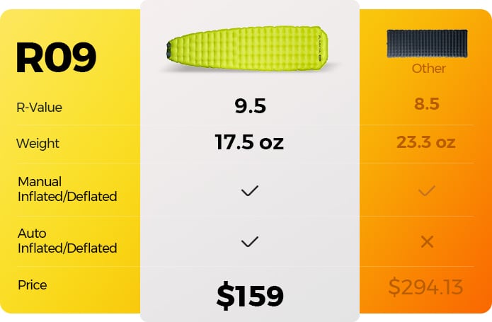 R-Value up to 9.5 | Auto-inflation and deflation | Ultra-light | Claim 3 pads for the price of one.