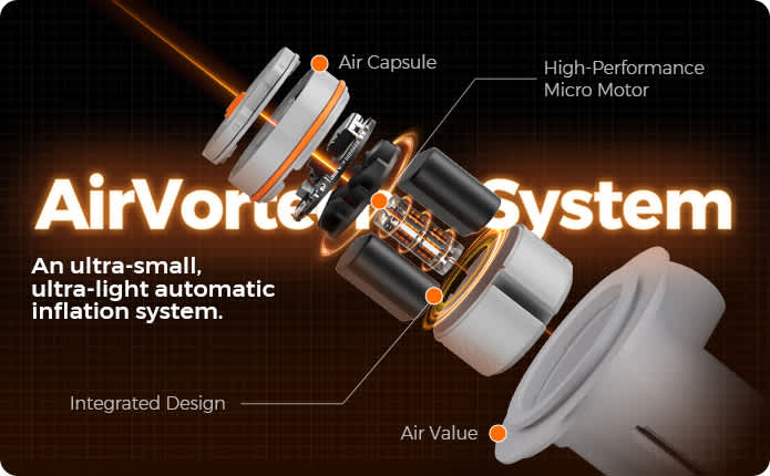 The Air Capsule features a special designed micro motor in an ultra-light, integrated design. The lightweight Air Valve is integrated into the inflatable product.