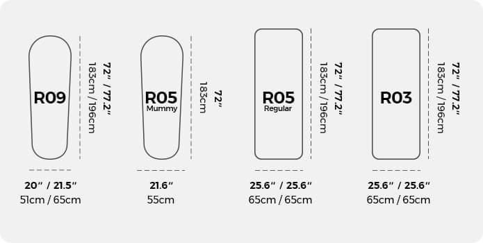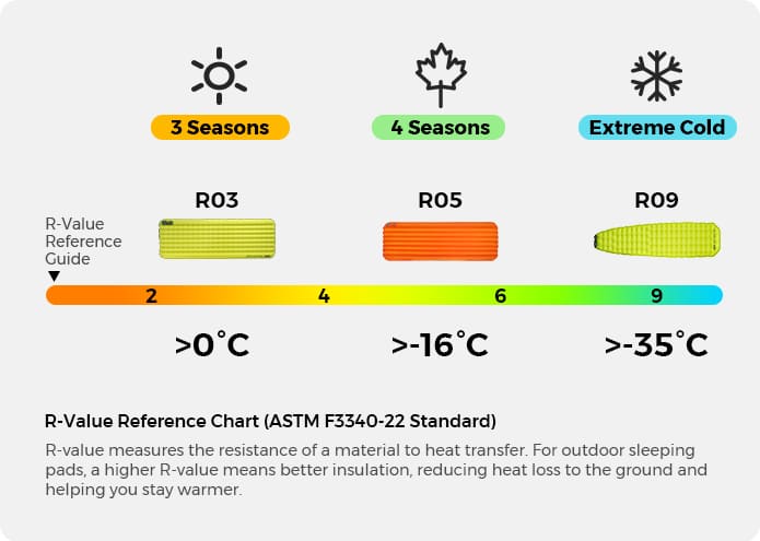 The R05, with an R-value of 5.6, is ideal for temperatures from 0°C to -5°C, offering a balance of spacious comfort and portability for year-round outdoor use.